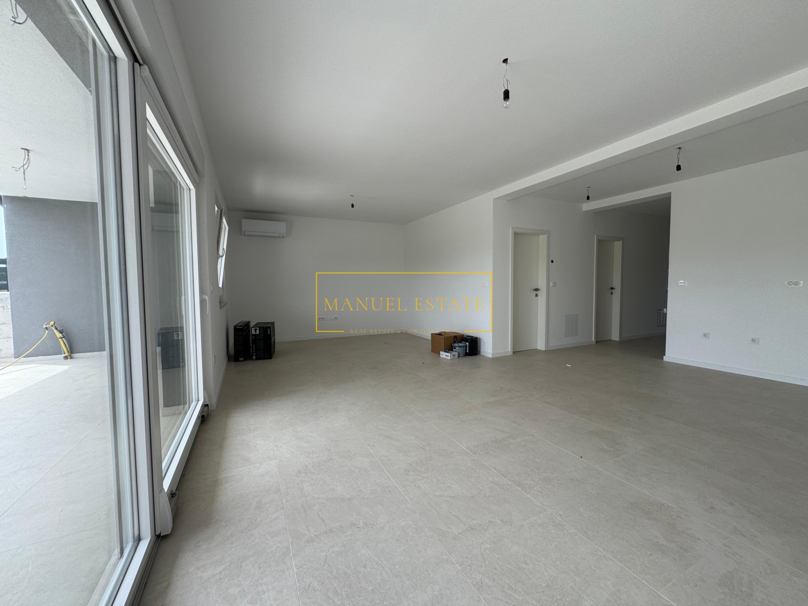 The terrace offers a beautiful view of the olive grove and unspoiled nature, and an added advantage is that there is no possibility of construction in this area since it is located on the edge of the building zone. The apartment is equipped with air conditioning units for heating and cooling, and the first phase for underfloor heating has already been installed.